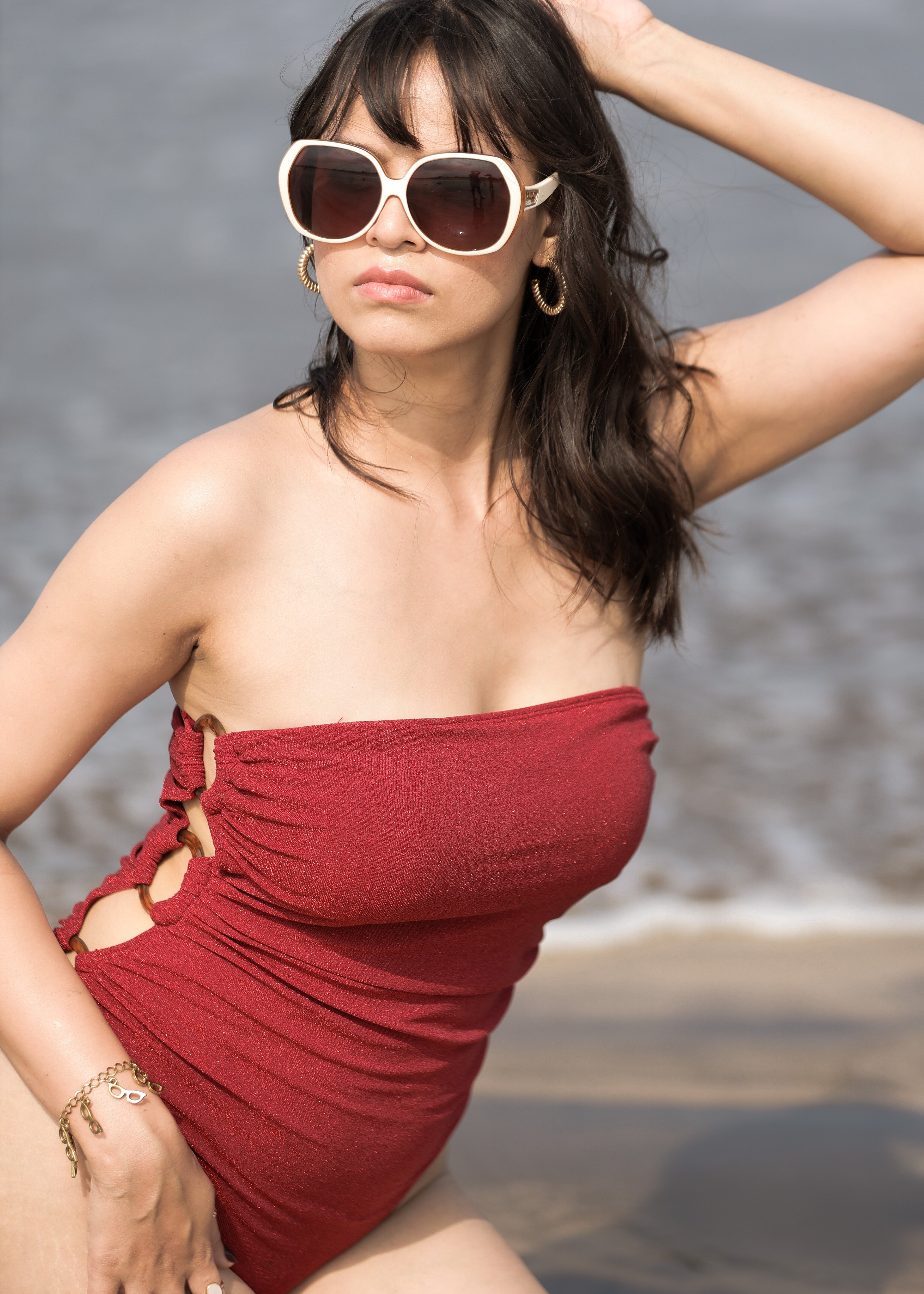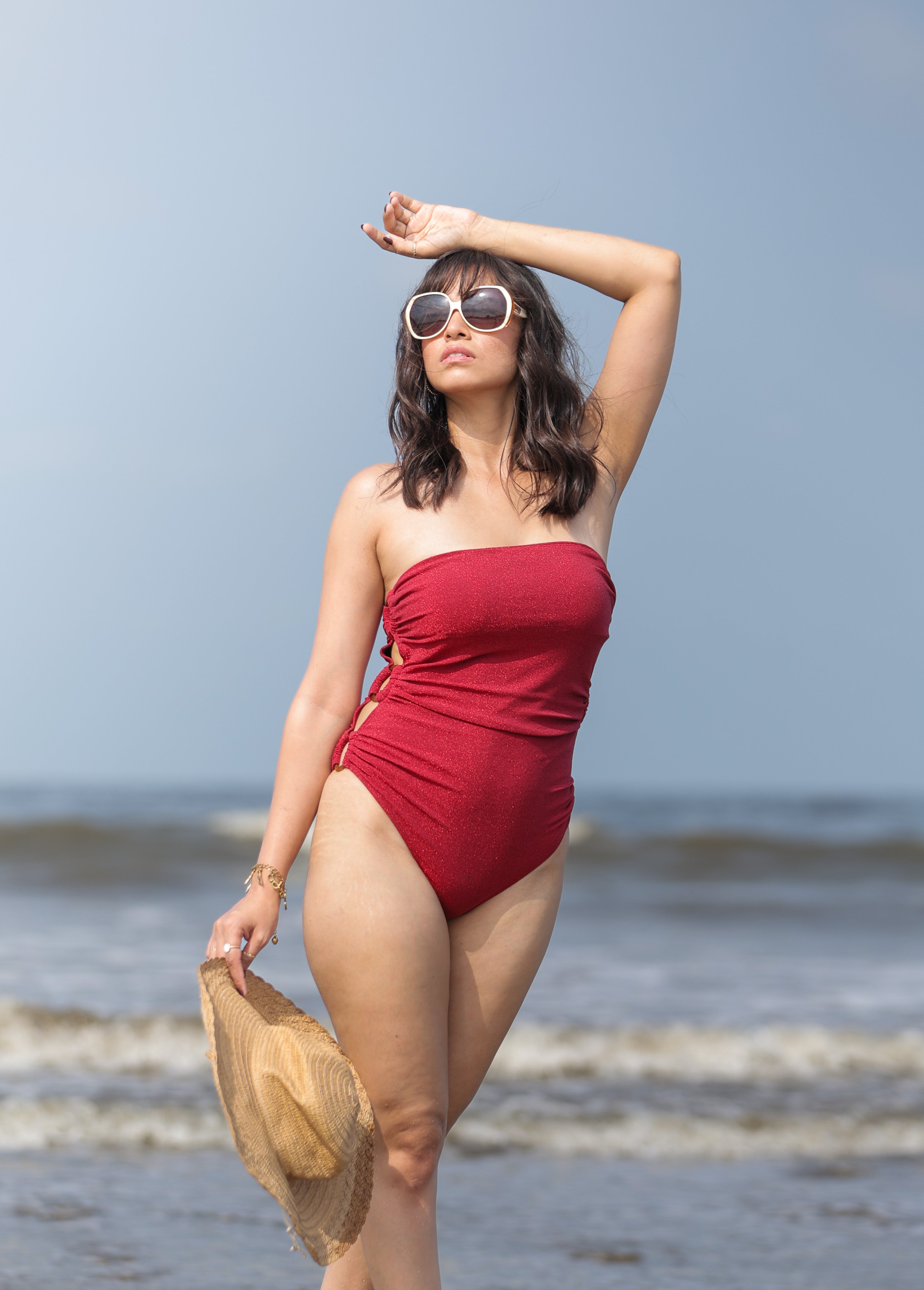 Shimmery maroon monokini with ring details and a detachable strap — bold meets beautiful.