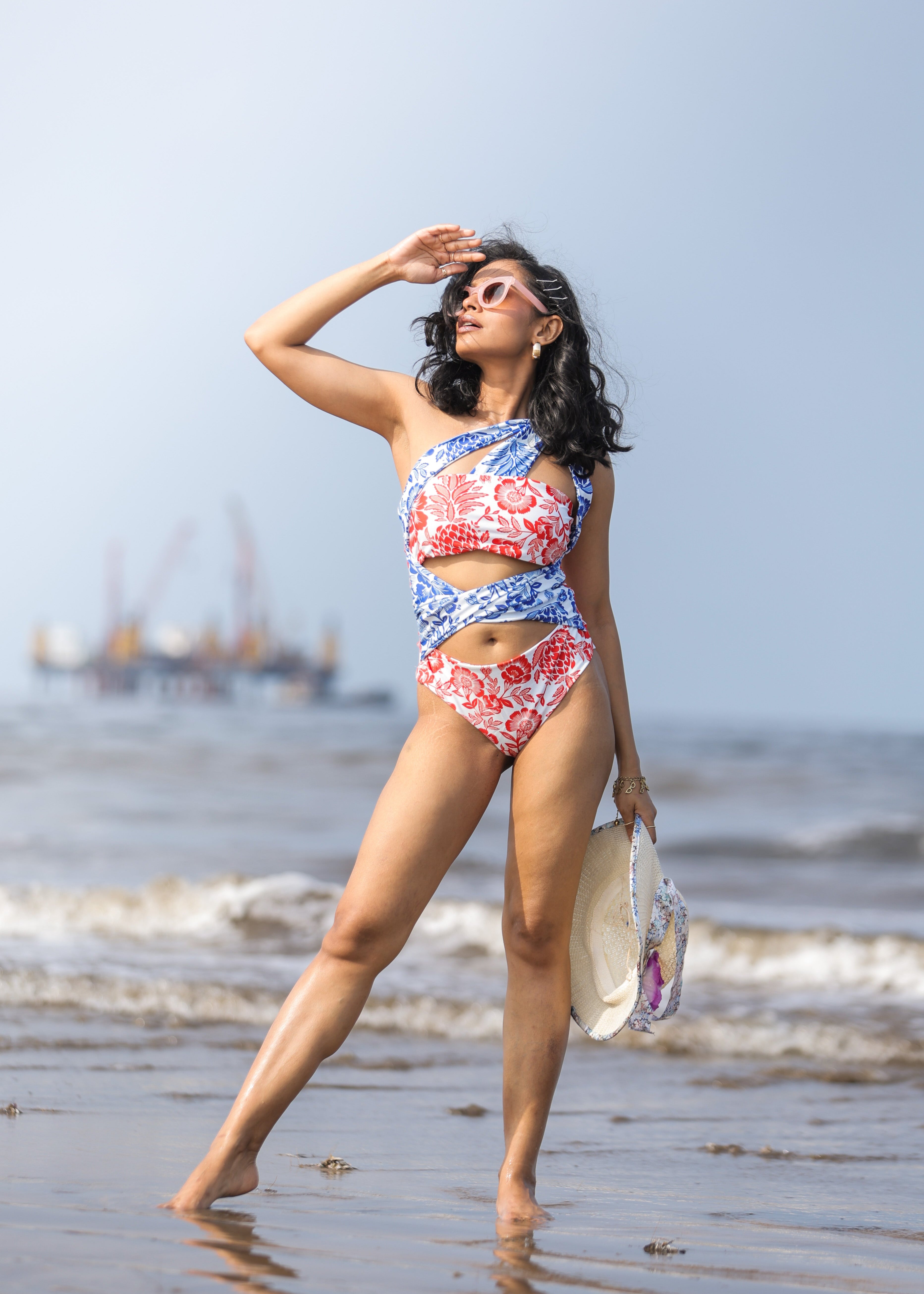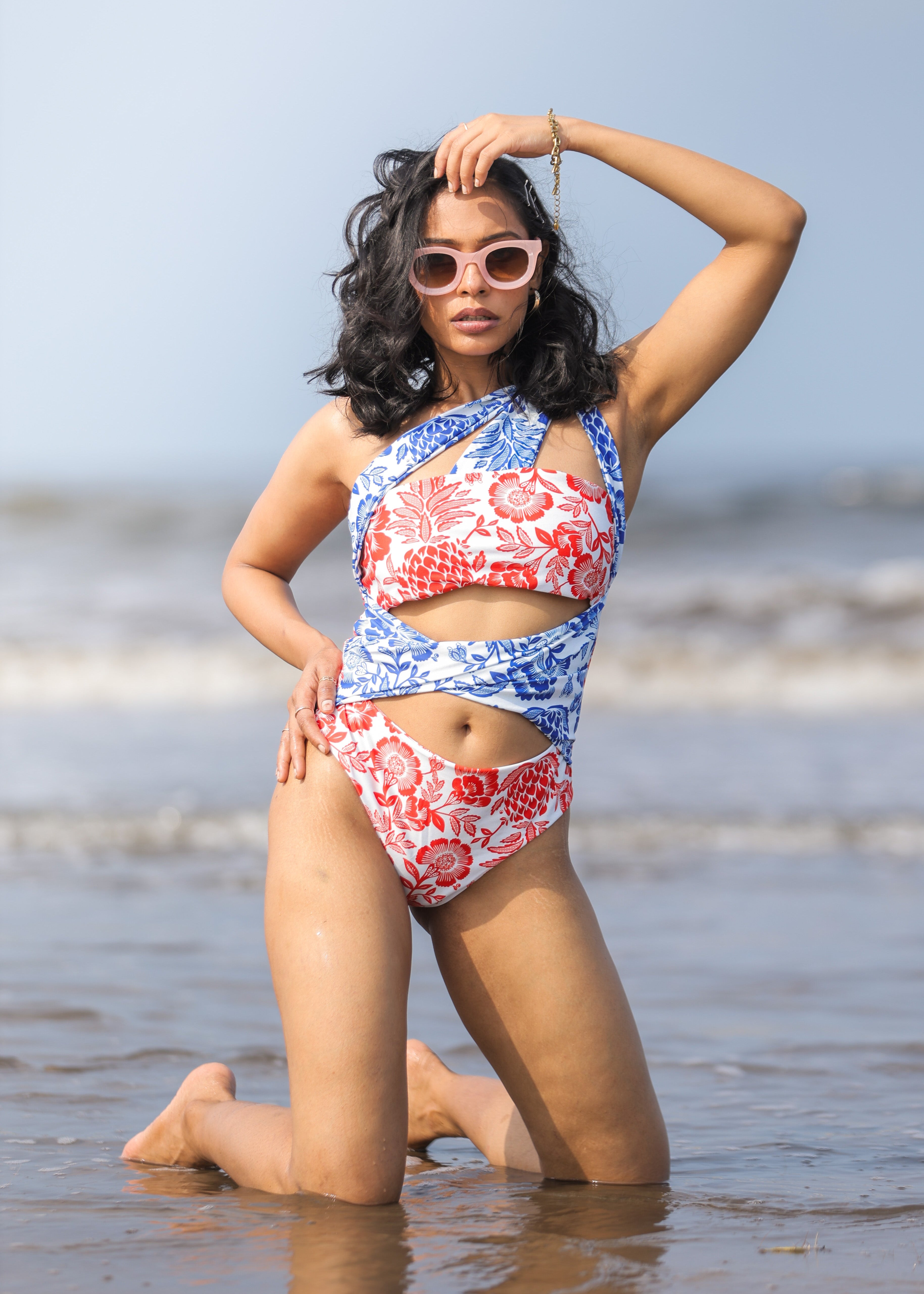 Bright orange and blue cut-out monokini that hugs your body just right — bold, fun, and flattering.