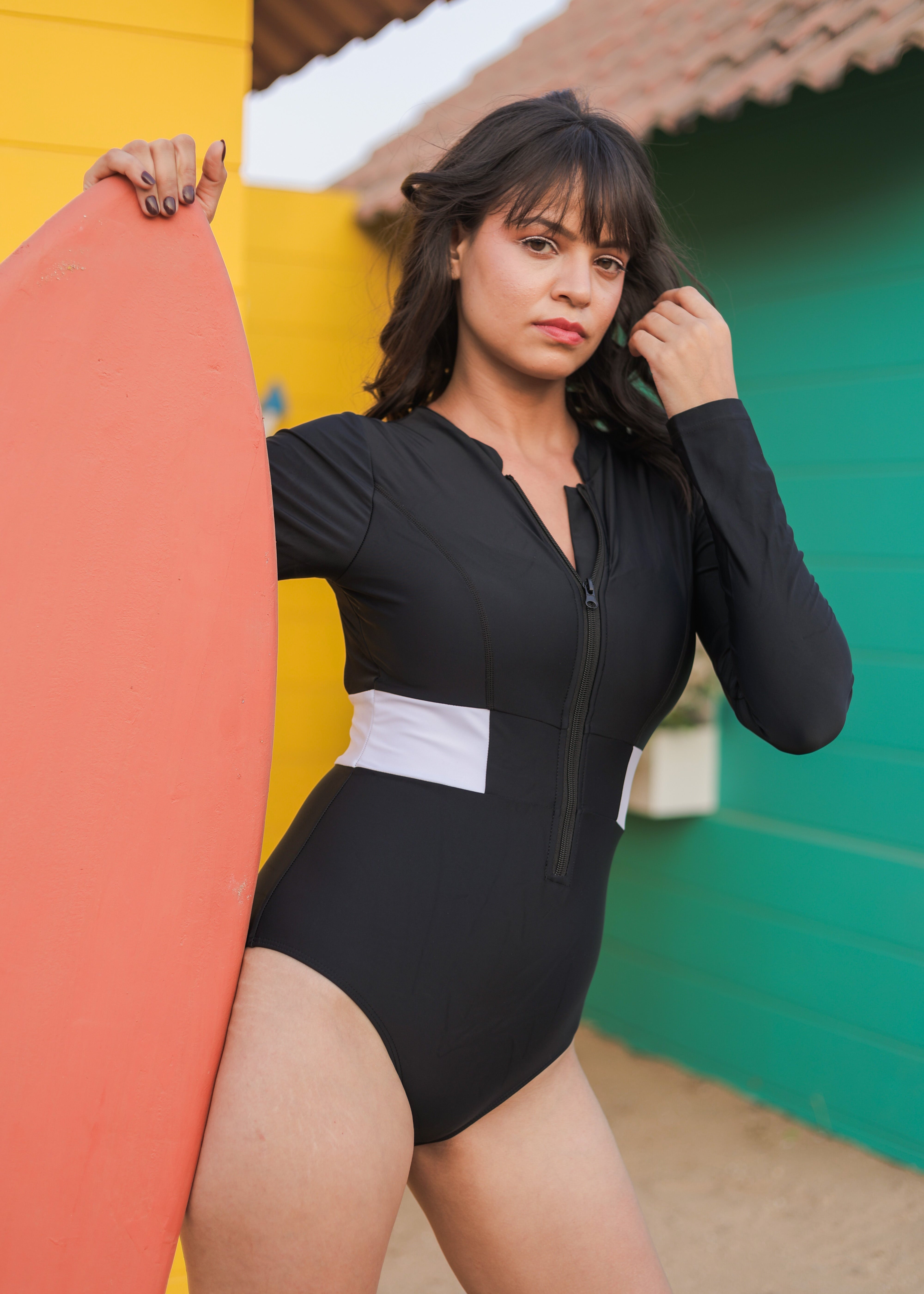Black and white surf suit with sleek white strap detailing — modern, secure, and striking.